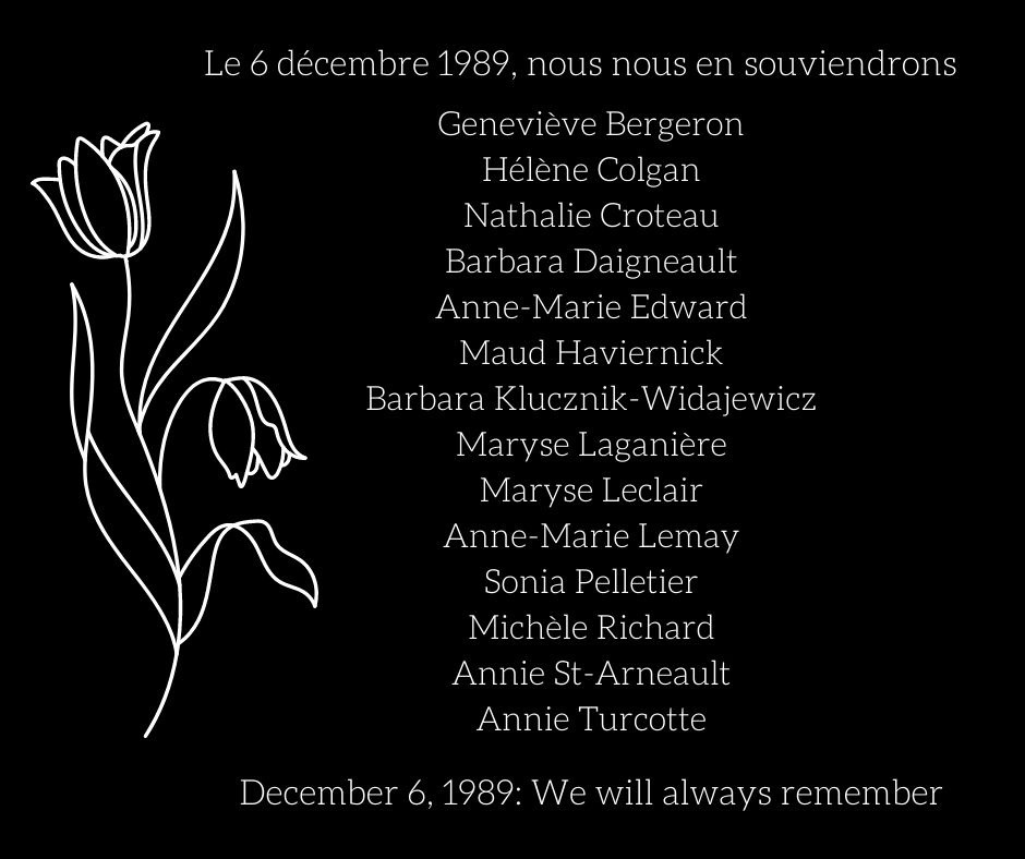 We Will Always Remember Posted byme2meladybugDecember 6, 2021Posted inUncategorized @Polytechnique #WeRemember #JeMeSouviens Share this: Click to share on X (Opens in new window) X Click to share on Facebook (Opens in new window) Facebook Like Loading... Related